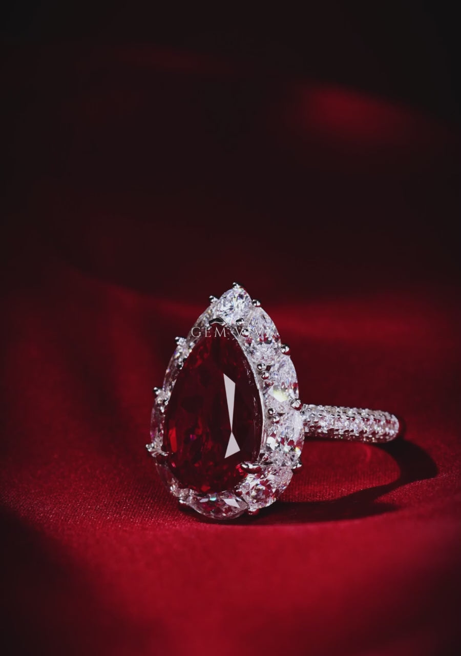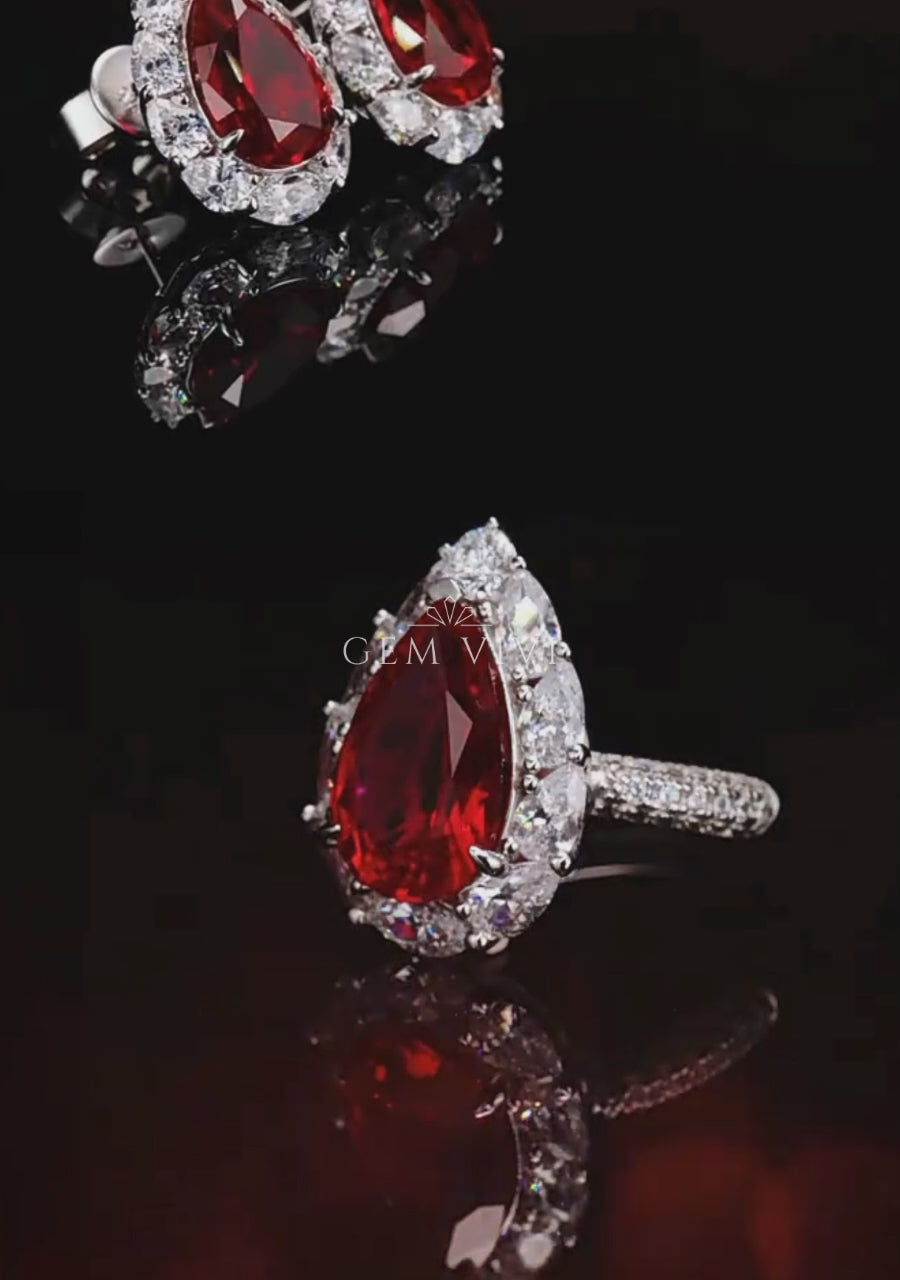 Caroline Pear Ruby Radiant Halo Ring