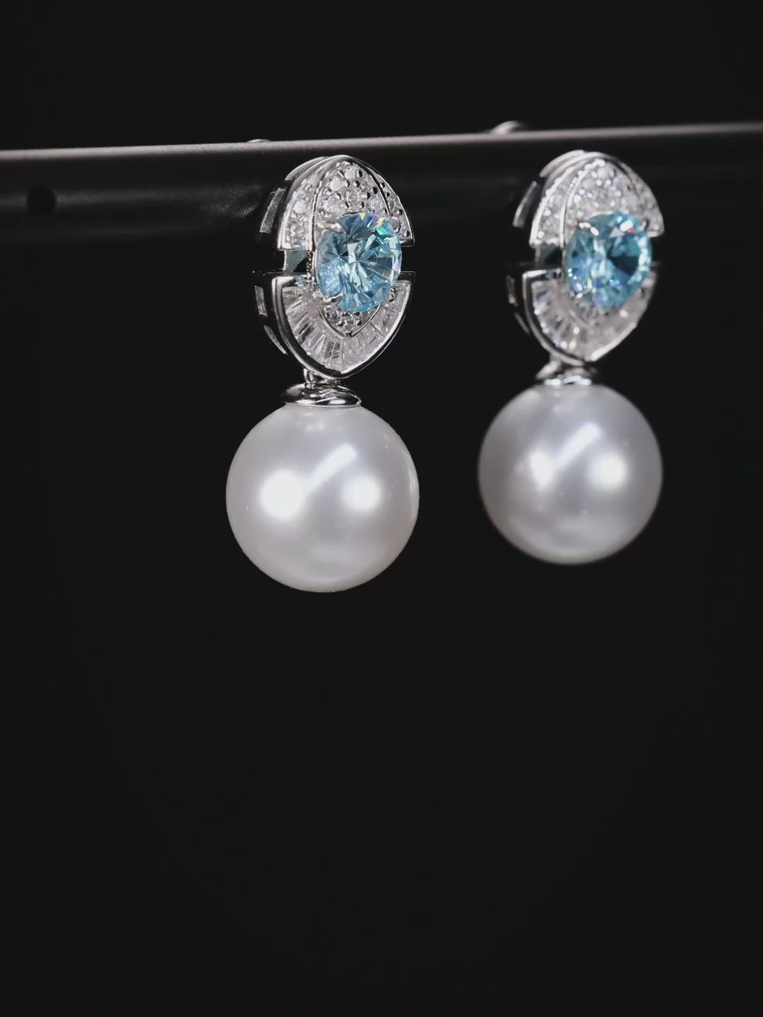 These elegant earrings feature sparkling round blue stones and luminous white pearl drops, accented by a halo of baguette and round stones for added brilliance. With their refined silhouette, they bring timeless luxury and sophistication to evening wear and formal occasions.