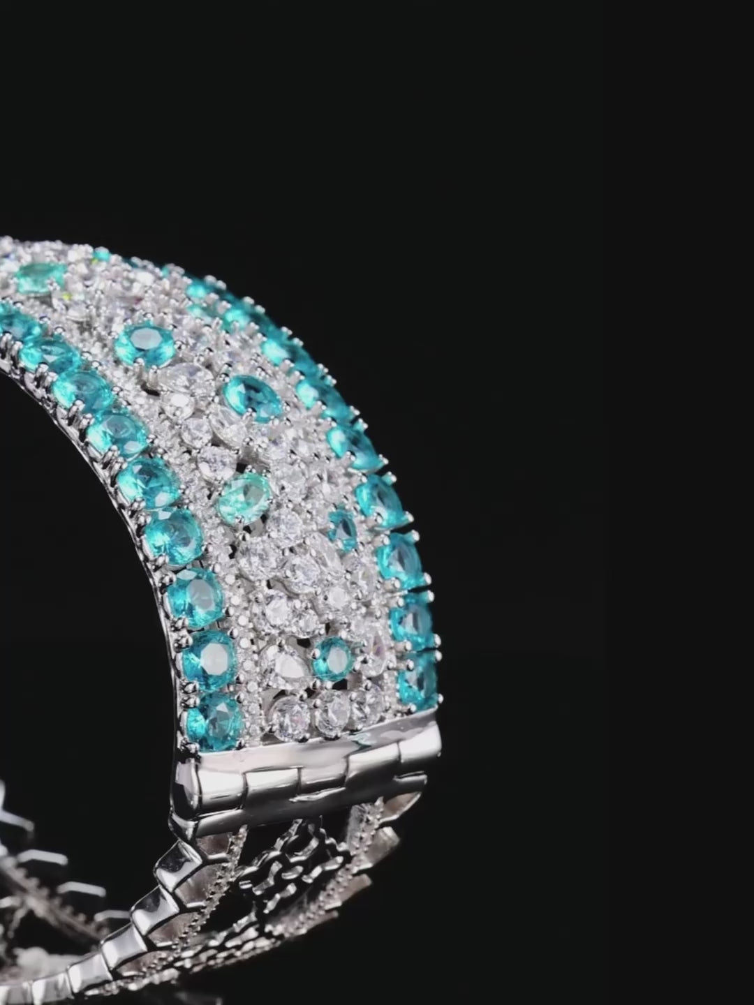 The Aquamarine Starlight Bangle dazzles with rows of vivid ocean blue stones and pavé-set white accents that shimmer with every movement. Crafted in 18k white gold plated silver and finished with intricate openwork, this bold bangle blends striking brilliance with refined craftsmanship, perfect for upscale events or elevating everyday style.