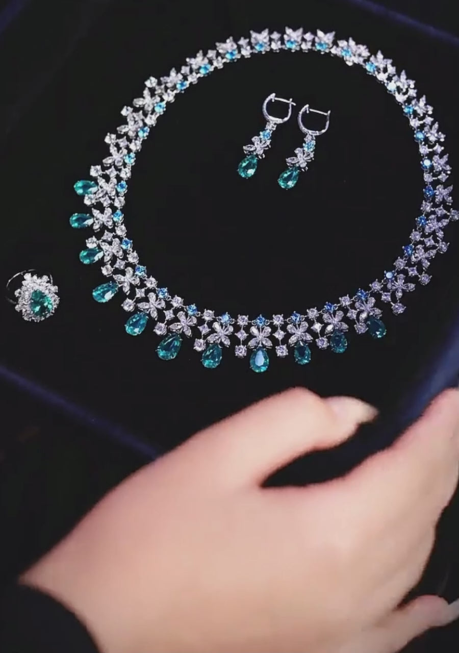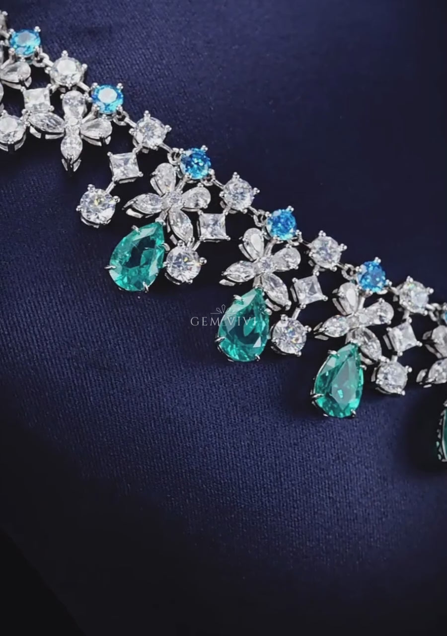The Emerald Skies Drop Earrings blend vibrant color with graceful sophistication. Sparkling white stones cascade into soft sky-blue accents, leading to a striking emerald-green pear drop that brings the perfect pop of luxurious color. Each element is arranged in a delicate, airy silhouette that moves beautifully with every turn.
