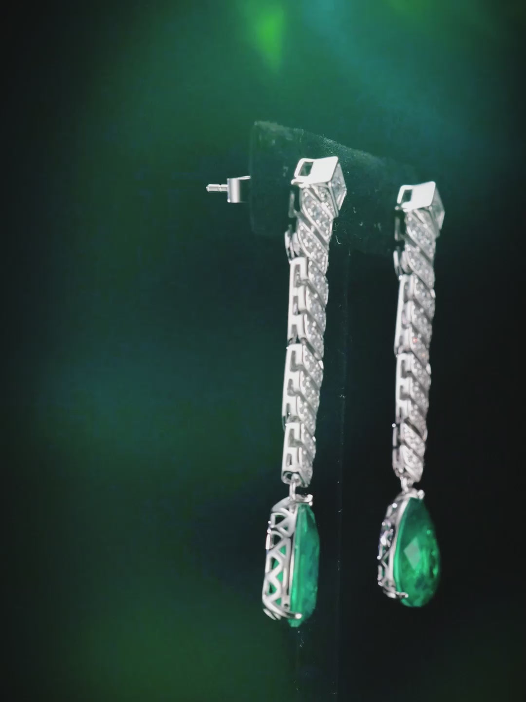 These sleek drop earrings feature vivid pear-cut green stones suspended from pavé-set chevron bars. Crafted in 18k white gold, their modern silhouette and timeless sophistication make them perfect for evening elegance or upscale occasions.