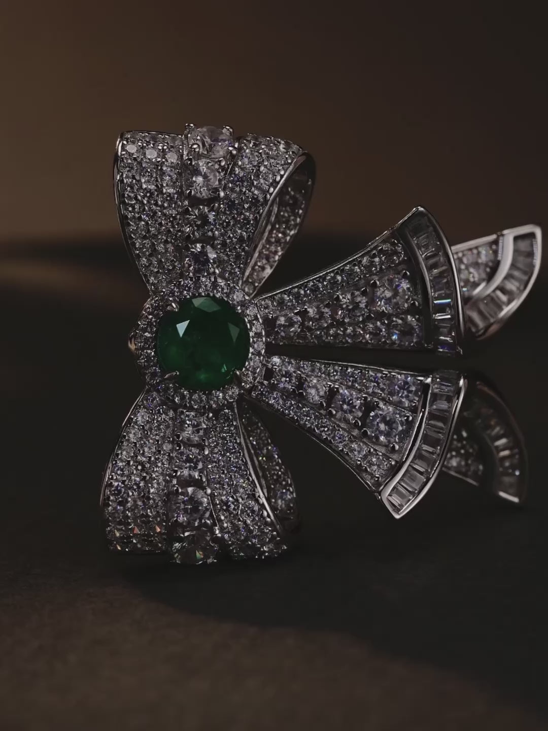 This elegant bow brooch sparkles with brilliant white stones, crowned by a vivid emerald centerpiece. Timeless and refined, it adds vintage-inspired charm and sophistication, perfect for elevating formalwear with a graceful finishing touch.