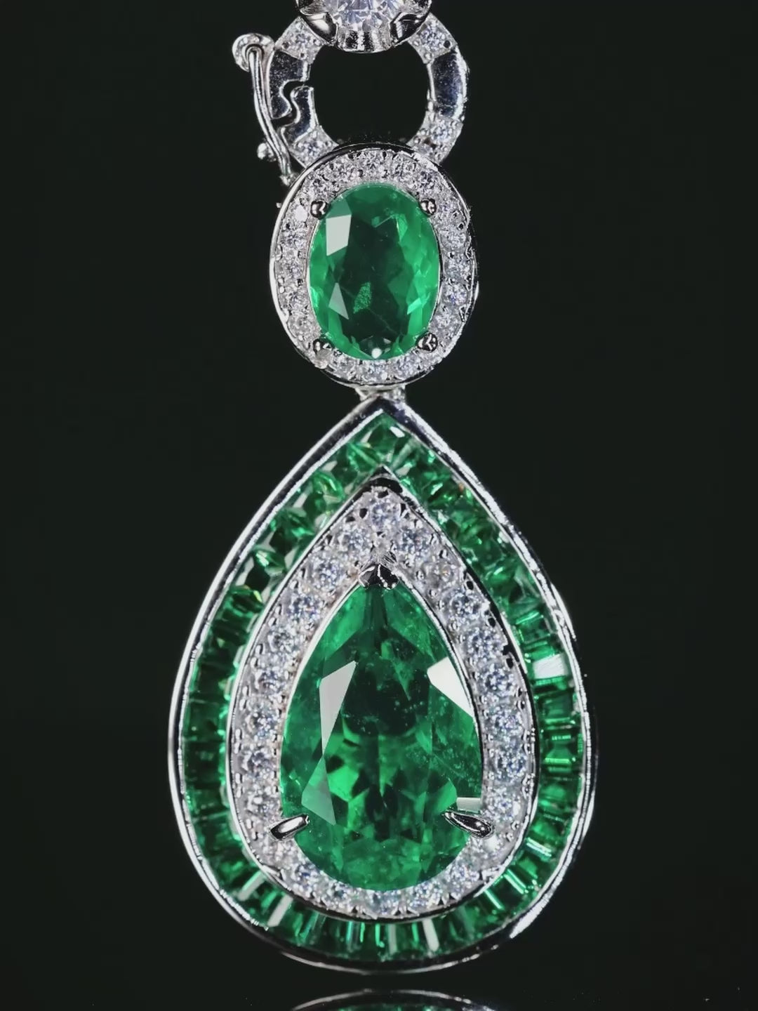 These earrings feature pear-cut green simulated emeralds framed by double halos of round and baguette-cut stones for brilliance at every angle. With vibrant contrast and a bold teardrop silhouette, they’re perfect for special events or elevating everyday style.