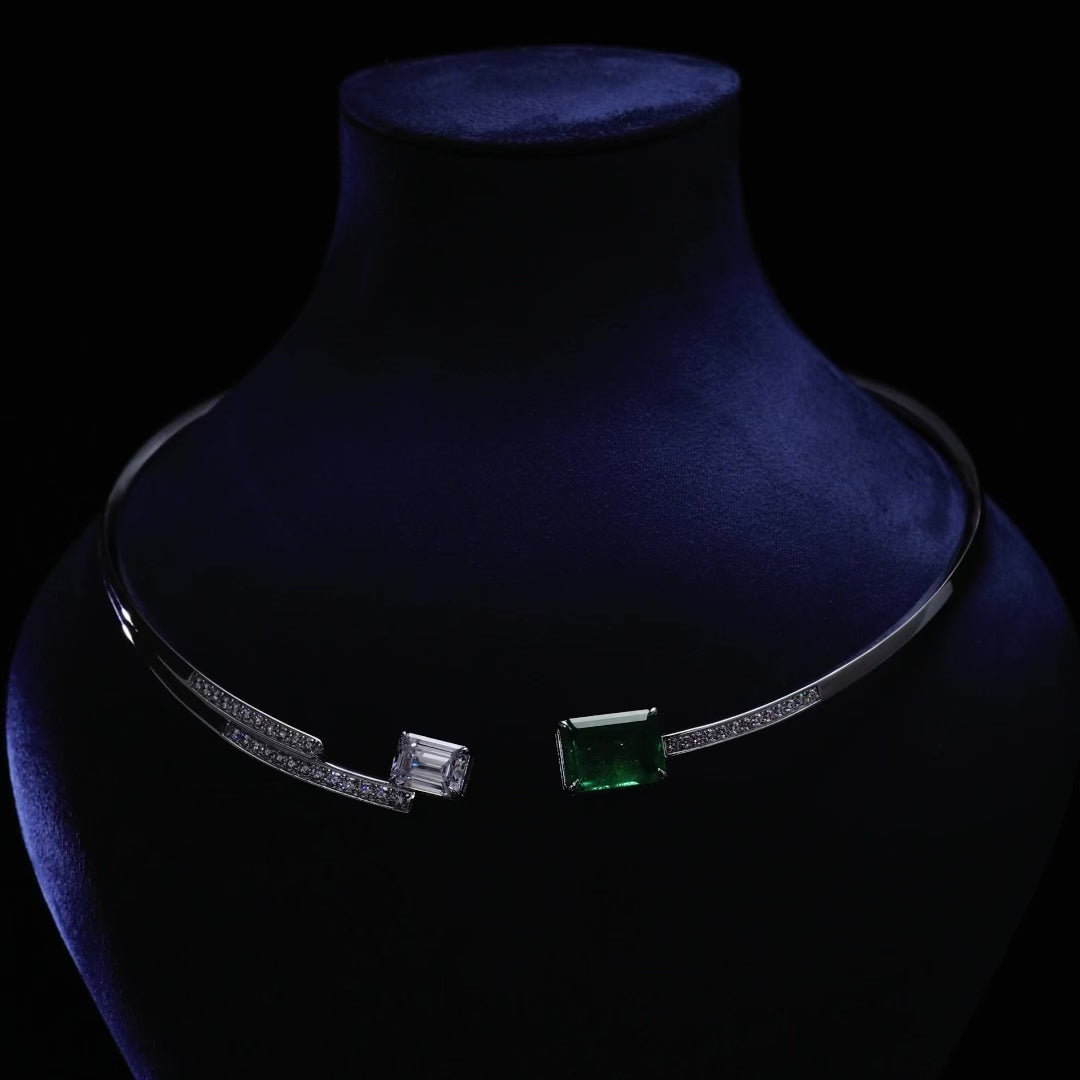 This open collar necklace features a bold emerald-cut green stone set opposite a sparkling emerald-cut clear stone. Minimalist band, accented with delicate pavé.
