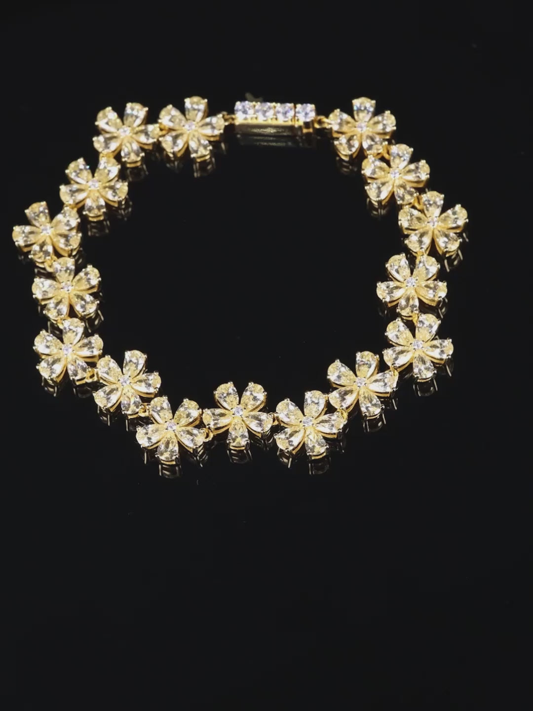 Elevate your style with this floral bracelet, featuring flower-shaped clusters adorned with sparkling stones. Finished in high-polish gold, it combines timeless elegance and playful charm.