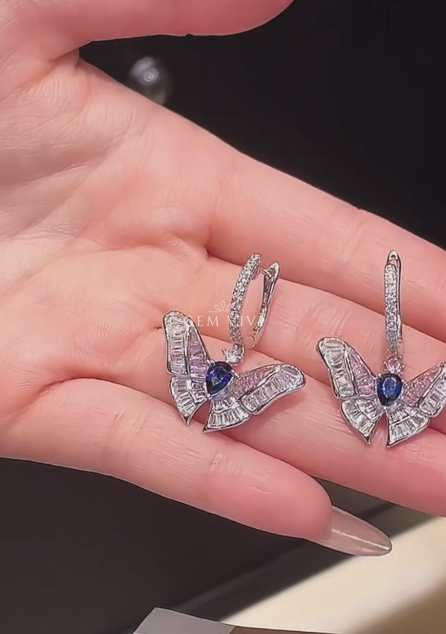 The Blush Wing Sapphire Drop Earrings feature delicate butterfly-inspired wings accented with soft pink tones and a vivid blue center stone. Suspended from a slender, stone-lined hoop, the design adds graceful movement while maintaining a refined silhouette.