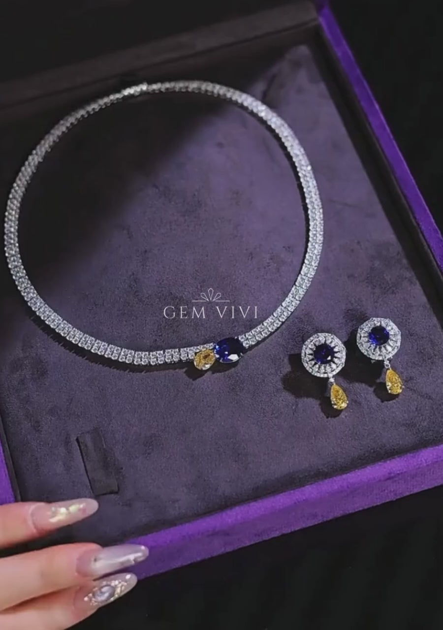 The Dual Gem Elegance Tennis Necklace features a continuous line of brilliant white stones, finished with a striking pairing of deep blue and golden yellow center accents. The contrast of color adds a refined focal point while maintaining a clean, timeless silhouette.