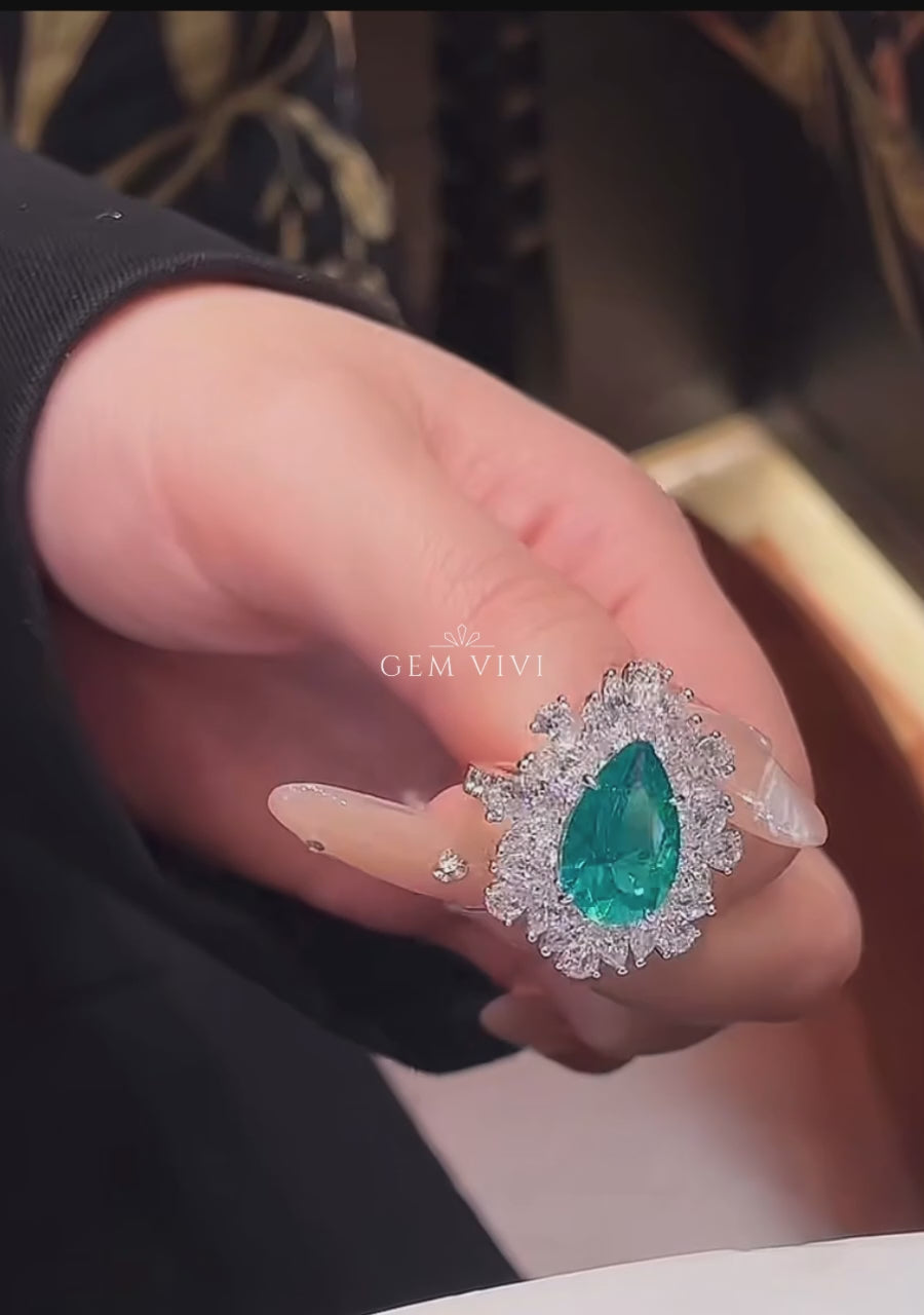 The Emerald Radiance Halo Ring features a striking pear-cut green center stone surrounded by a brilliant halo of shimmering white stones. The floral-inspired arrangement enhances the depth and vibrancy of the centerpiece, creating a luminous, eye-catching design.