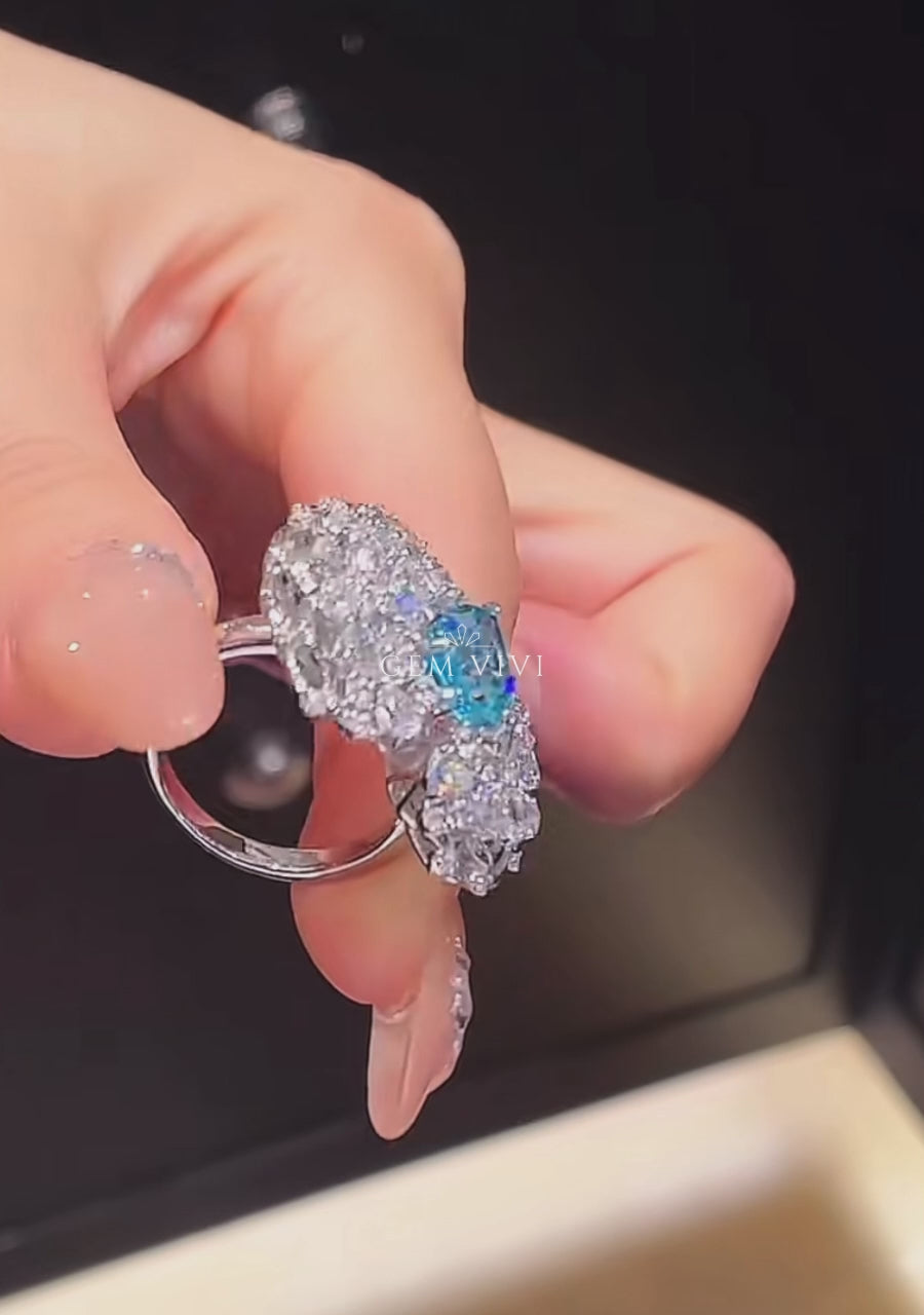 The Aqua Bloom Cluster Ring showcases a luminous pear-cut aqua stone set at the center of a radiant floral-inspired cluster. Surrounded by layers of brilliant white stones, the design creates a full, blooming silhouette with exceptional sparkle from every angle.