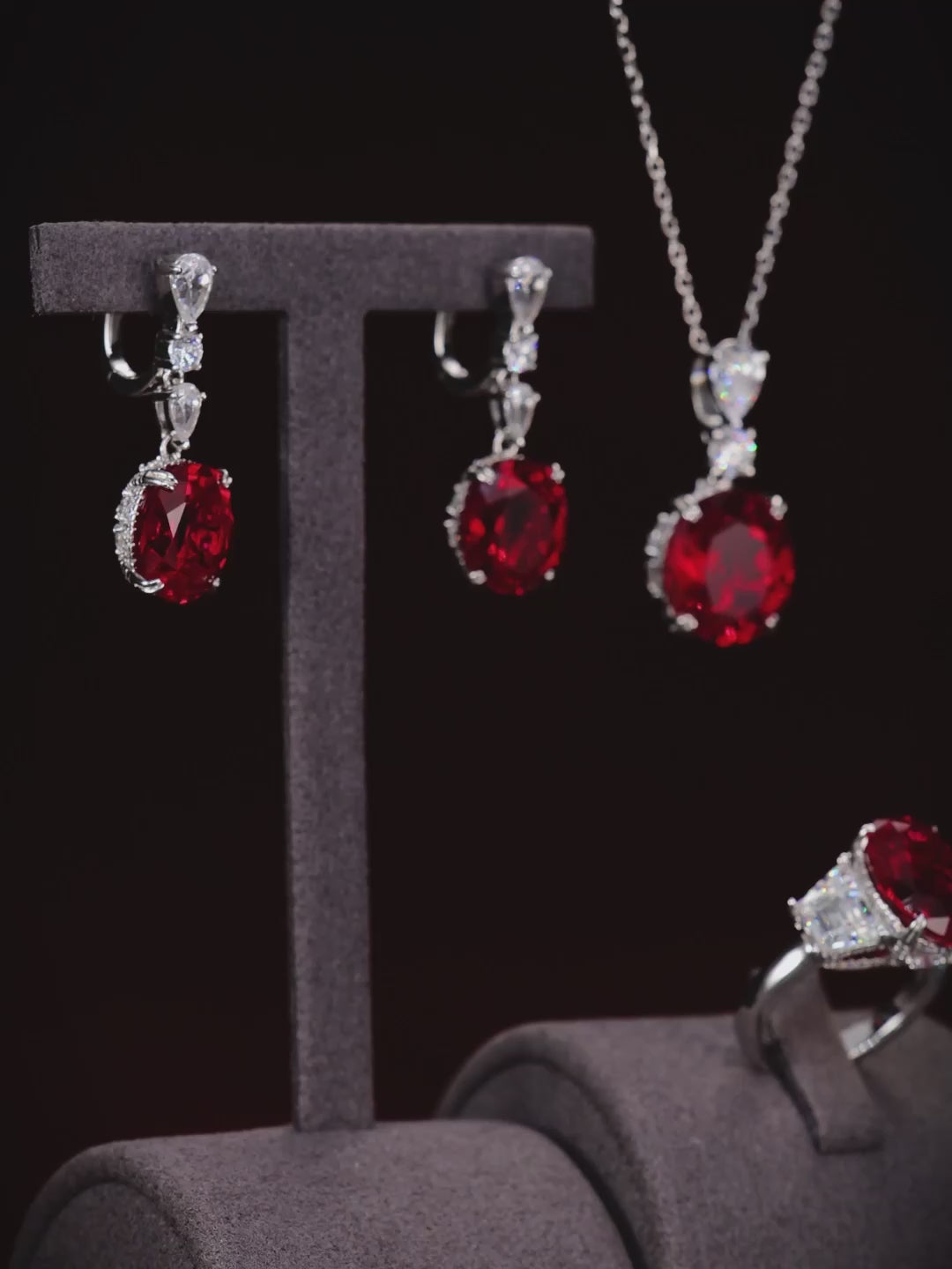 These earrings feature oval-cut red rubies suspended beneath pear and round white stones, set in 18k gold-plated sterling silver. With their tiered silhouette and timeless romance, they add sensational color and elegance to any occasion.