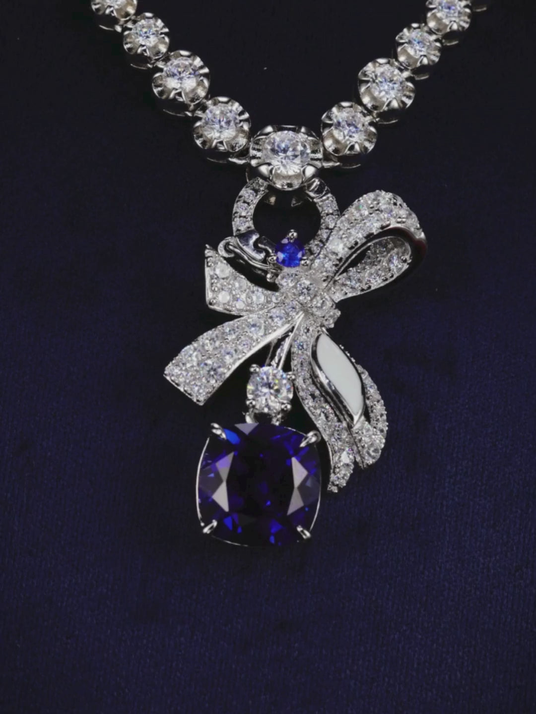 Elevate your style with these ribbon motif earrings, adorned with sparkling white stones and a cushion-cut blue sapphire drop. Perfect for special occasions or adding bold elegance to everyday looks.