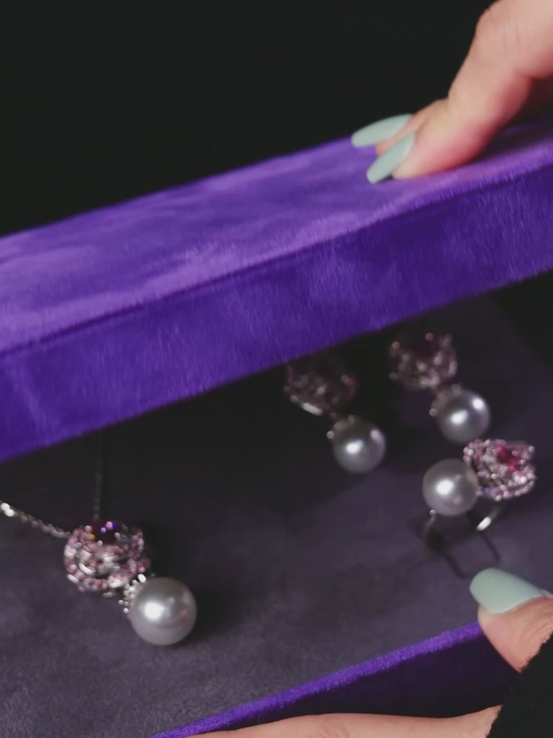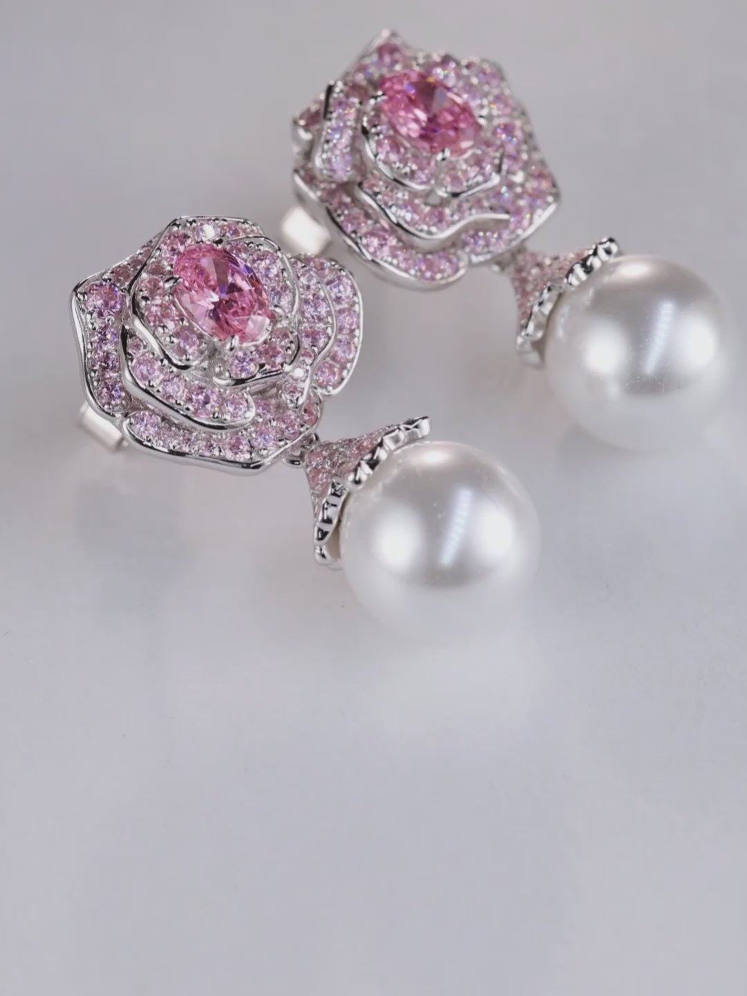 These earrings feature oval pink stones set in rose-shaped designs with sparkling white stones and elegant pearl drops. Delicate and romantic, they bring soft sophistication to any look.