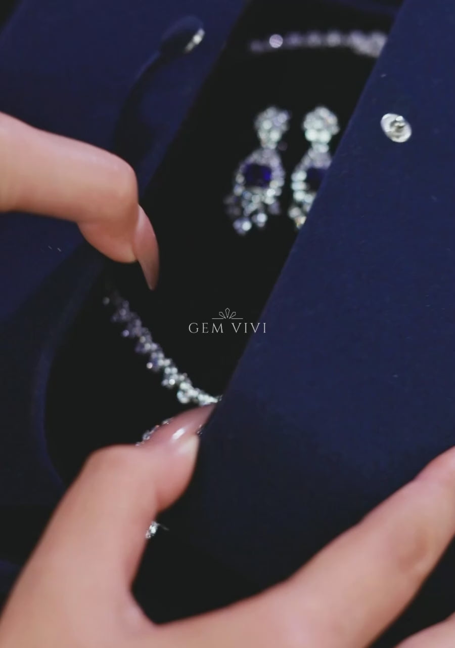 These sapphire blue chandelier earrings dazzle with pear-cut and brilliant white stones, creating radiant movement and bold sparkle. Crafted in 18k white gold, their glamorous design is perfect for grand occasions, evening elegance, and unforgettable entrances.