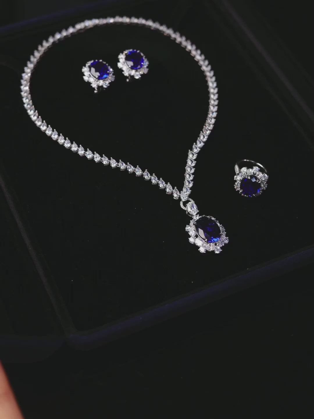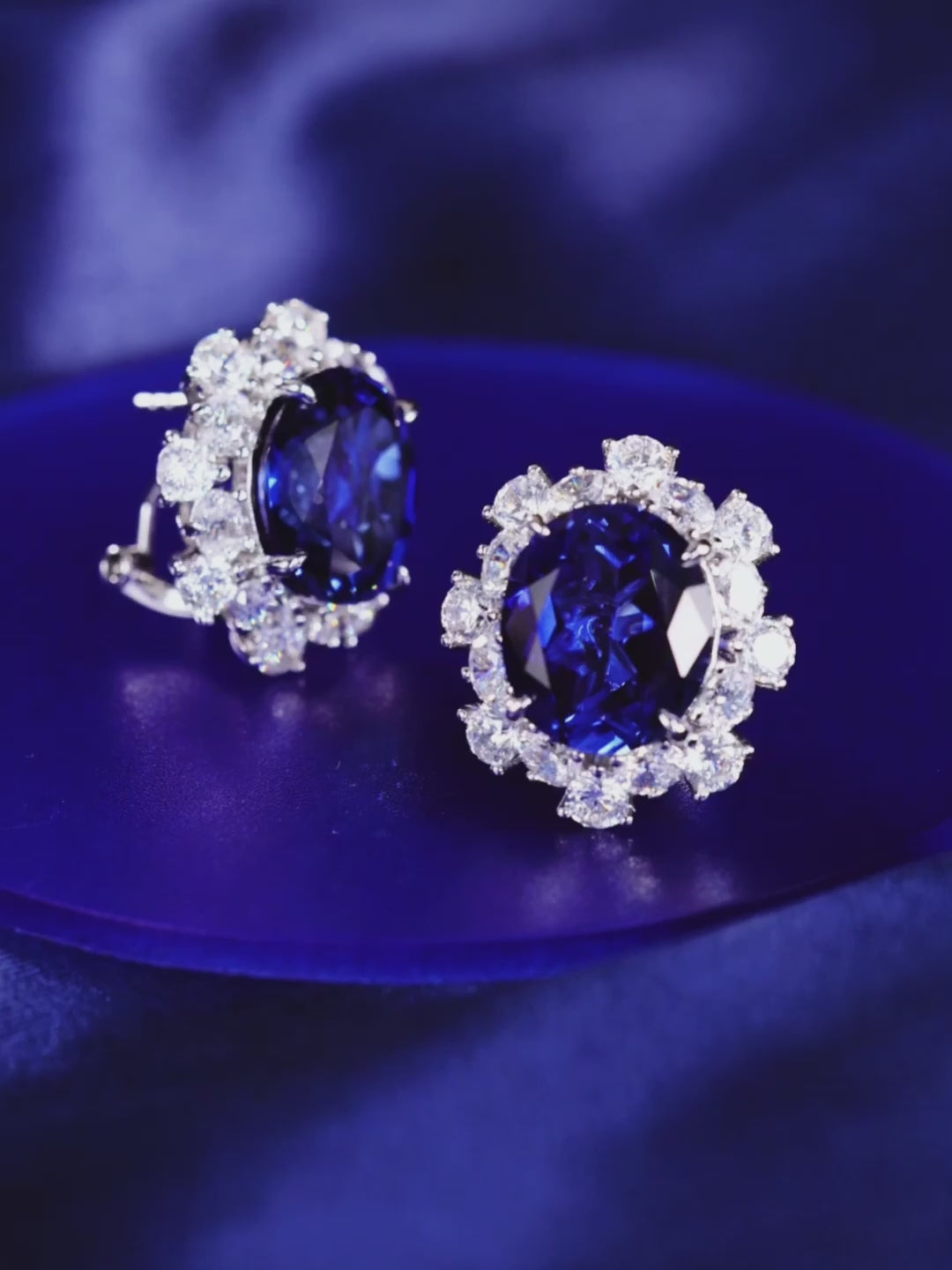 These oval cut Sapphire Halo Stud Earrings feature deep blue oval-cut stones encircled by a radiant halo of sparkling white stones. Set in 18k white gold-plated detail, they exude timeless elegance and refined sophistication, perfect for evening glamour or the perfect occasion.