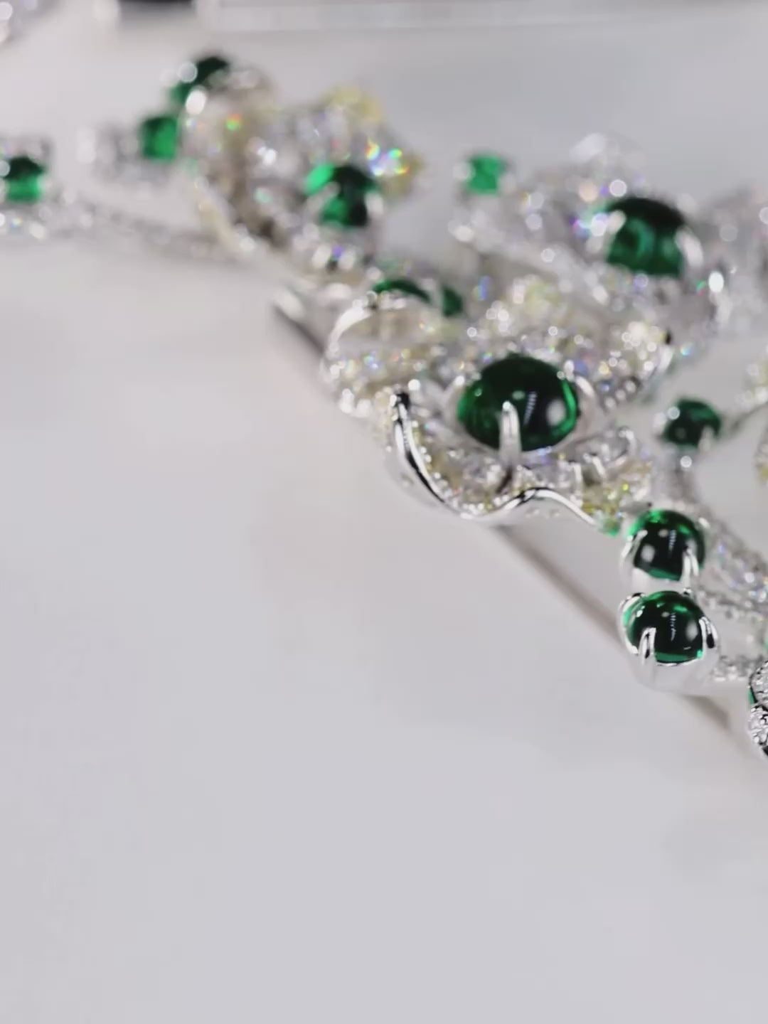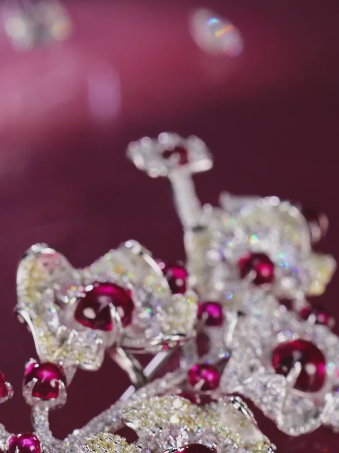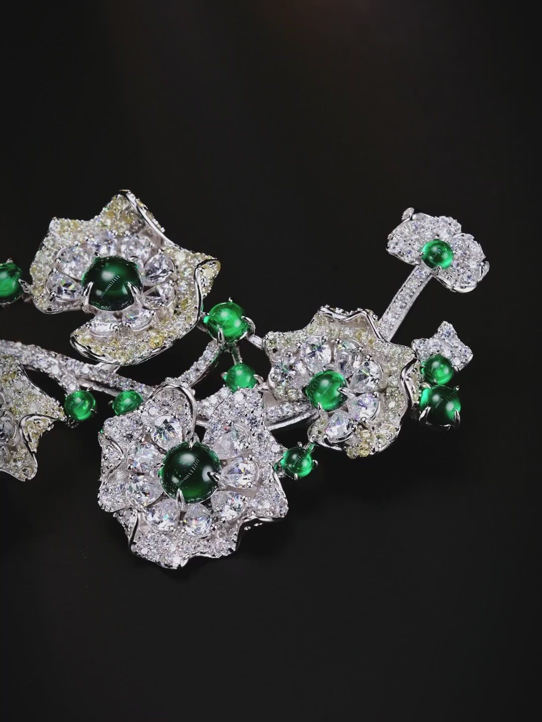 Intricately crafted in a cascading floral silhouette, this brooch blooms with brilliant pavé-set petals and rich gemstone centers, available in radiant ruby or lush emerald. A stunning statement of elegance, it’s perfect for adding botanical brilliance to formal wear or evening ensembles.