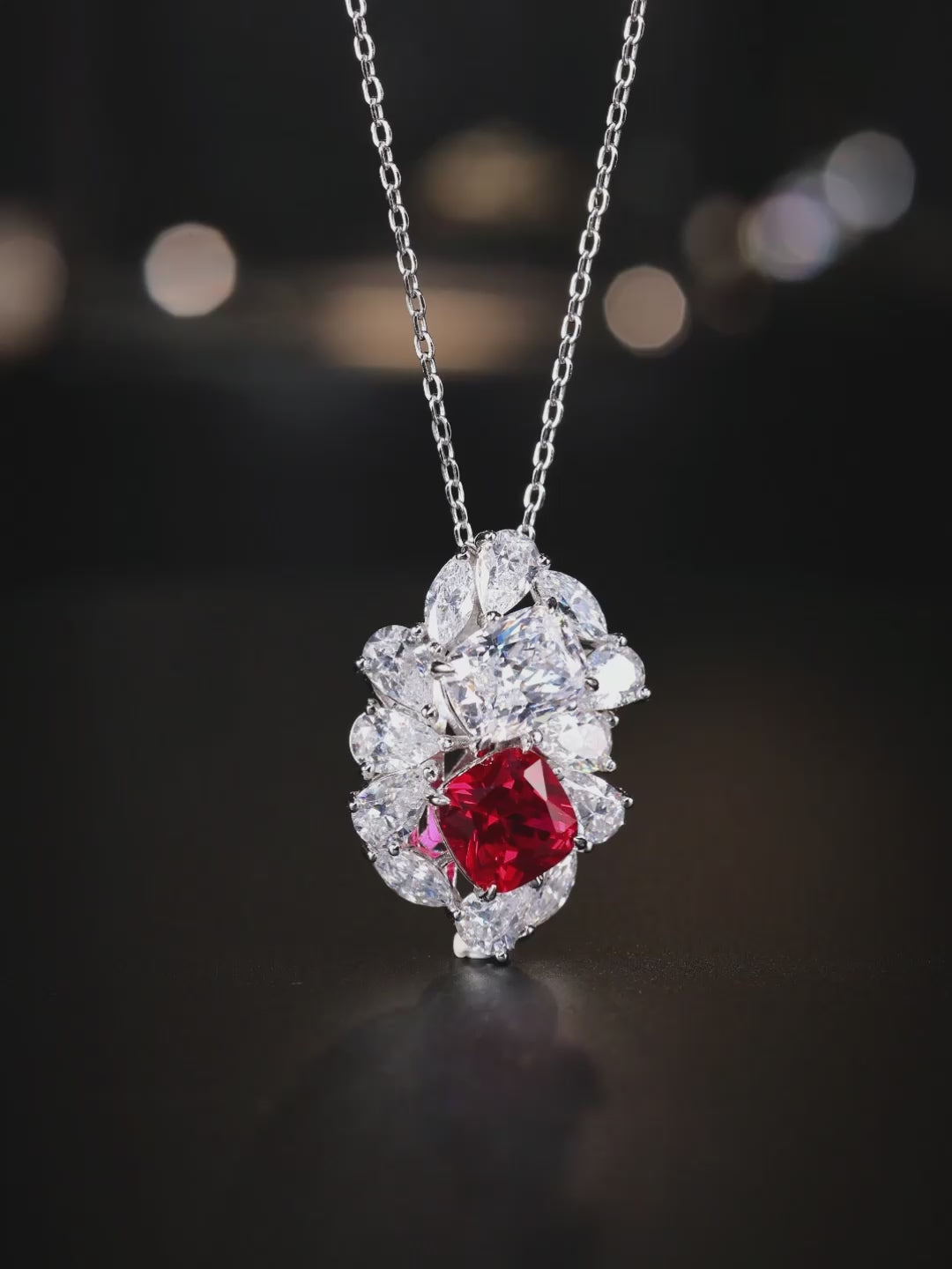 This necklace features a cushion-cut red ruby surrounded by marquise and pear-cut white stones in a radiant cluster design. Timeless and sophisticated, it’s a dazzling choice for signature moments or elegant gift-giving. ( Tennis Chain Shown in the Video Sold Separately.)