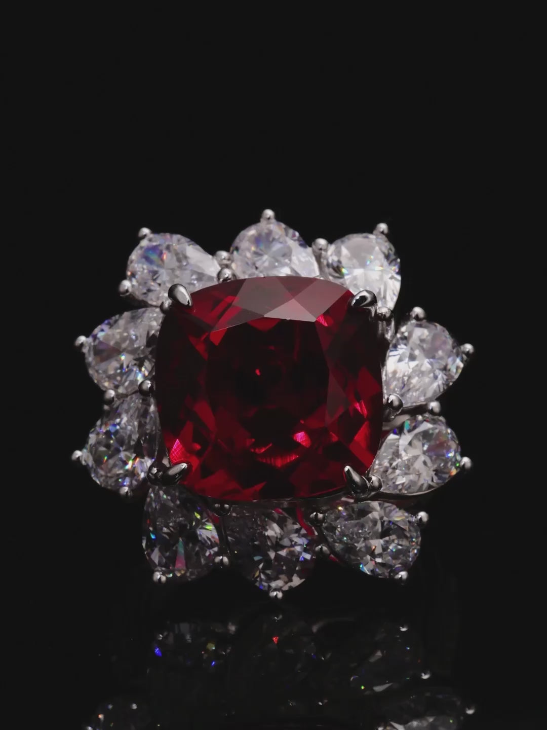 Make a bold impression with the Scarlet Radiance Ring, featuring a cushion-cut ruby center framed by pear-shaped accents. Expertly crafted for brilliance, it’s a striking statement of sophistication—perfect for milestones, gifting, or celebrating the power of vivid color.