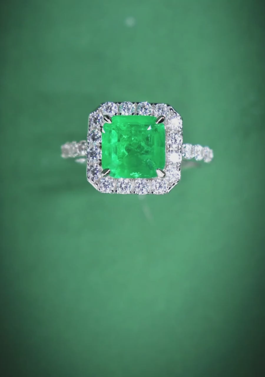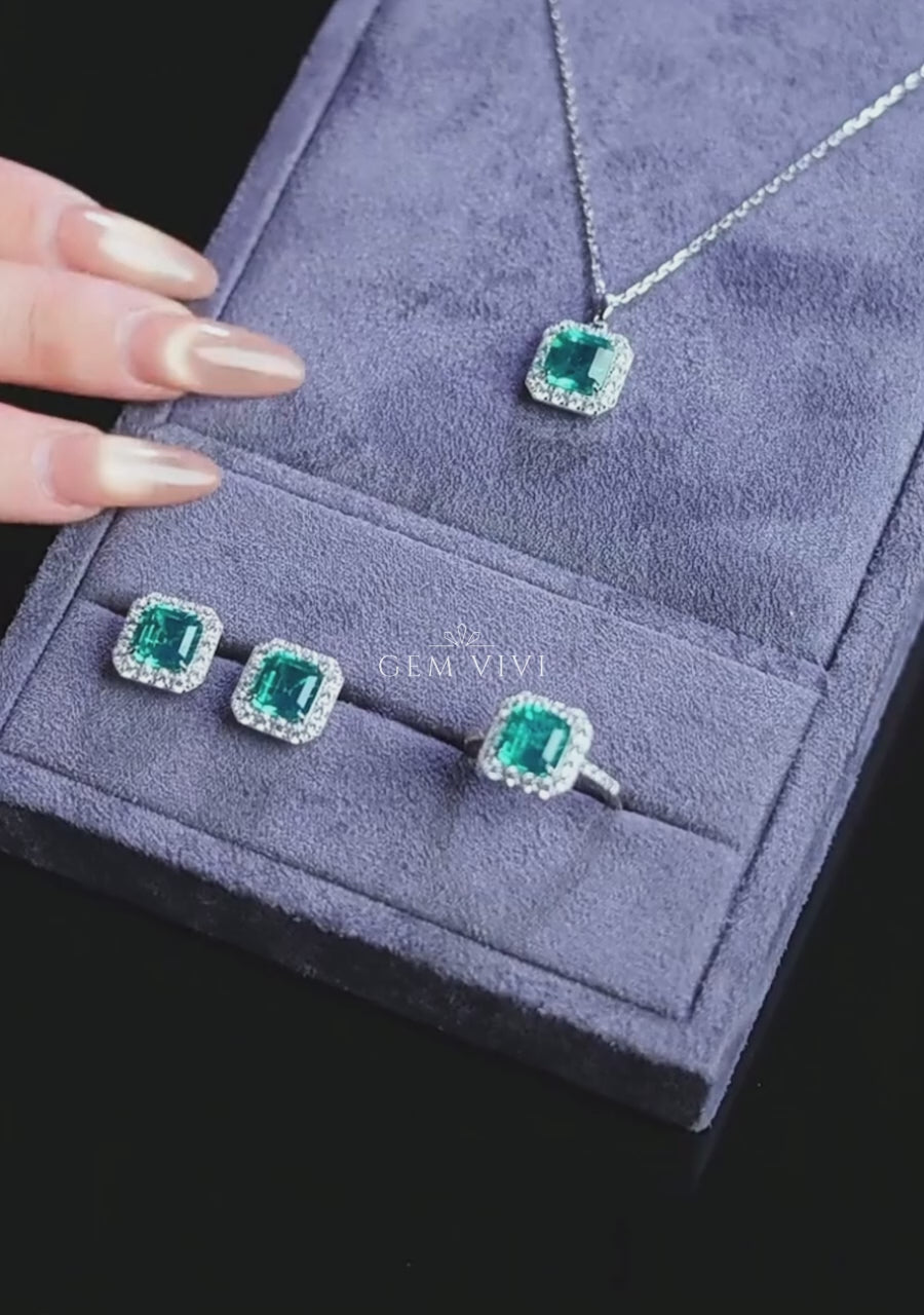 The Emerald Royale Halo Jewelry Set showcases rich green brilliance in a refined and timeless design. Each piece features a striking square emerald-cut center stone framed by a halo of shimmering clear accents that enhance its depth and sparkle.