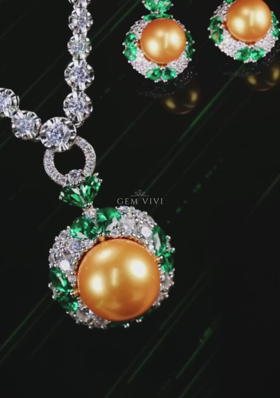 The Glowing Pearl Jewelry Set showcases a luxurious blend of radiant golden pearls and vibrant emerald-toned accents. Each piece features a luminous pearl at the center, surrounded by a sparkling halo of clear stones and rich green gems that create a regal floral-inspired design. (Loop Chain Shown in the video sold Separately)
